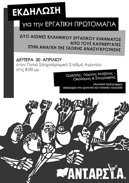 Στο Αγρίνιο, Παλιός Σιδηροδρομικός Σταθμός (8μμ). Εκδήλωση για την Εργατική Πρωτομαγιά με ομιλητή τον Γιώργο Αλεξάτο . Θα ακολουθήσει μουσικό πρόγραμμα με αφιέρωμα στο εργατικό και πολιτικό τραγούδι