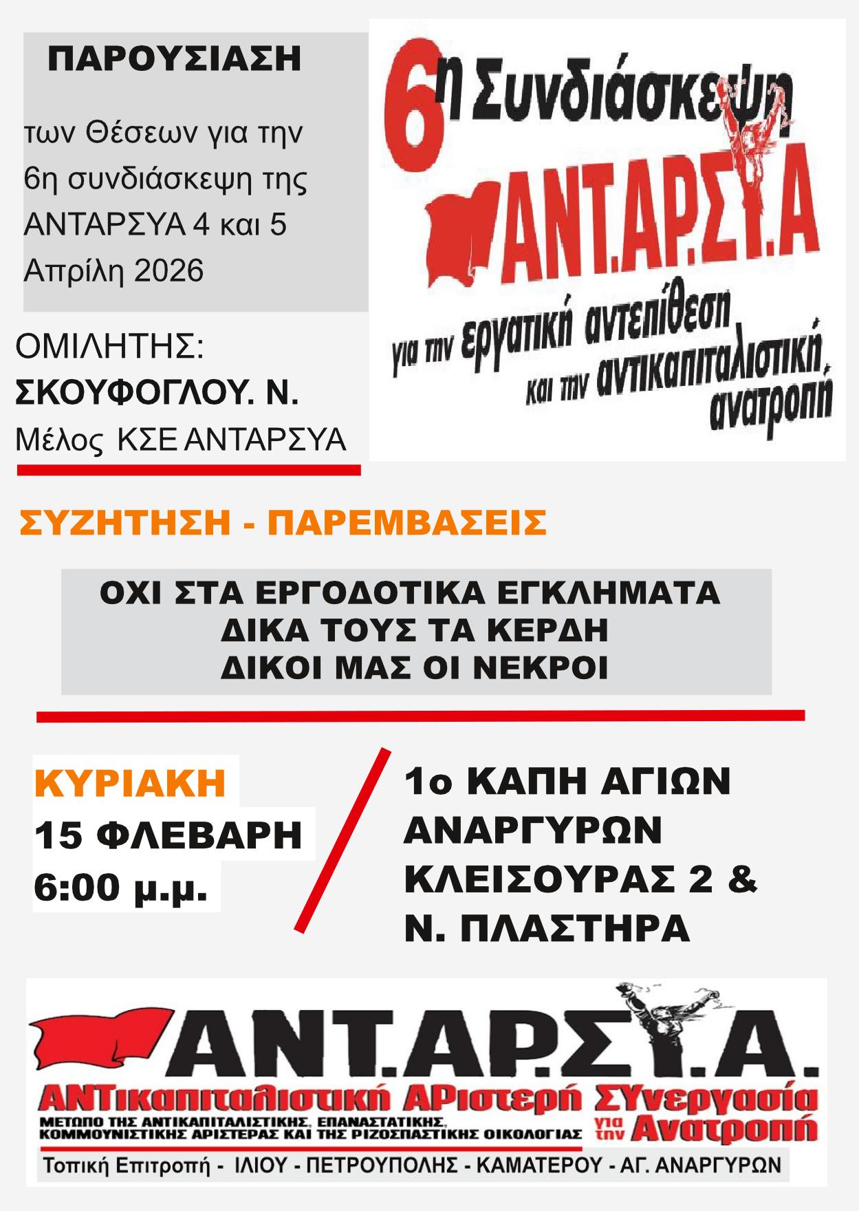 Παρουσίαση των θέσεων για την 6η Συνδιάσκεψη της ΑΝΤΑΡΣΥΑ (4&5 Απρίλη 2026) Ομιλητής : Ν. ΣΚΟΥΦΟΓΛΟΥ, Μέλος ΚΣΕ ΑΝΤΑΡΣΥΑ Κυριακή 15 Φλεβάρη 6:00μμ 1ο ΚΑΠΗ ΑΓΙΩΝ ΑΝΑΡΓΥΡΩΝ ΚΛΕΙΣΟΥΡΑΣ 2 & Ν.ΠΛΑΣΤΗΡΑ Categories: |