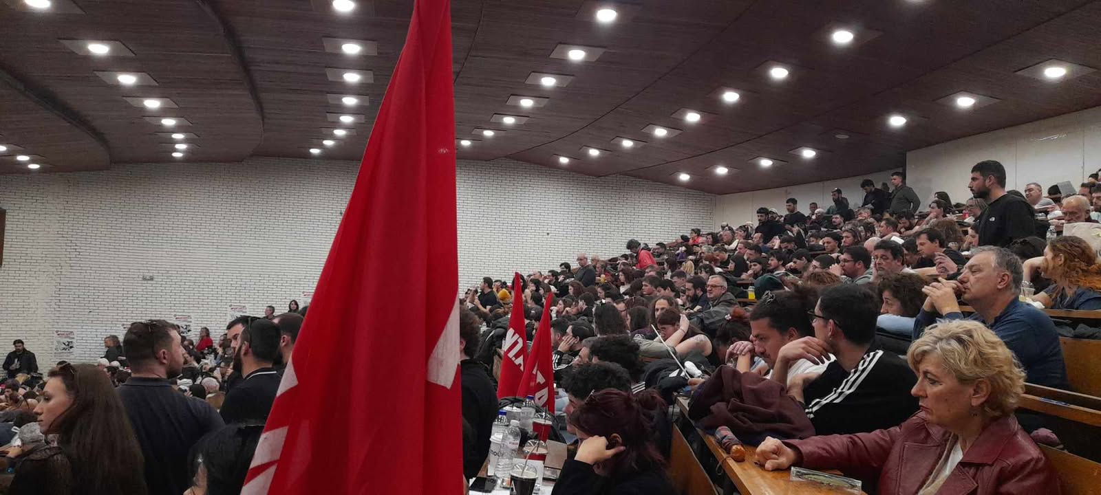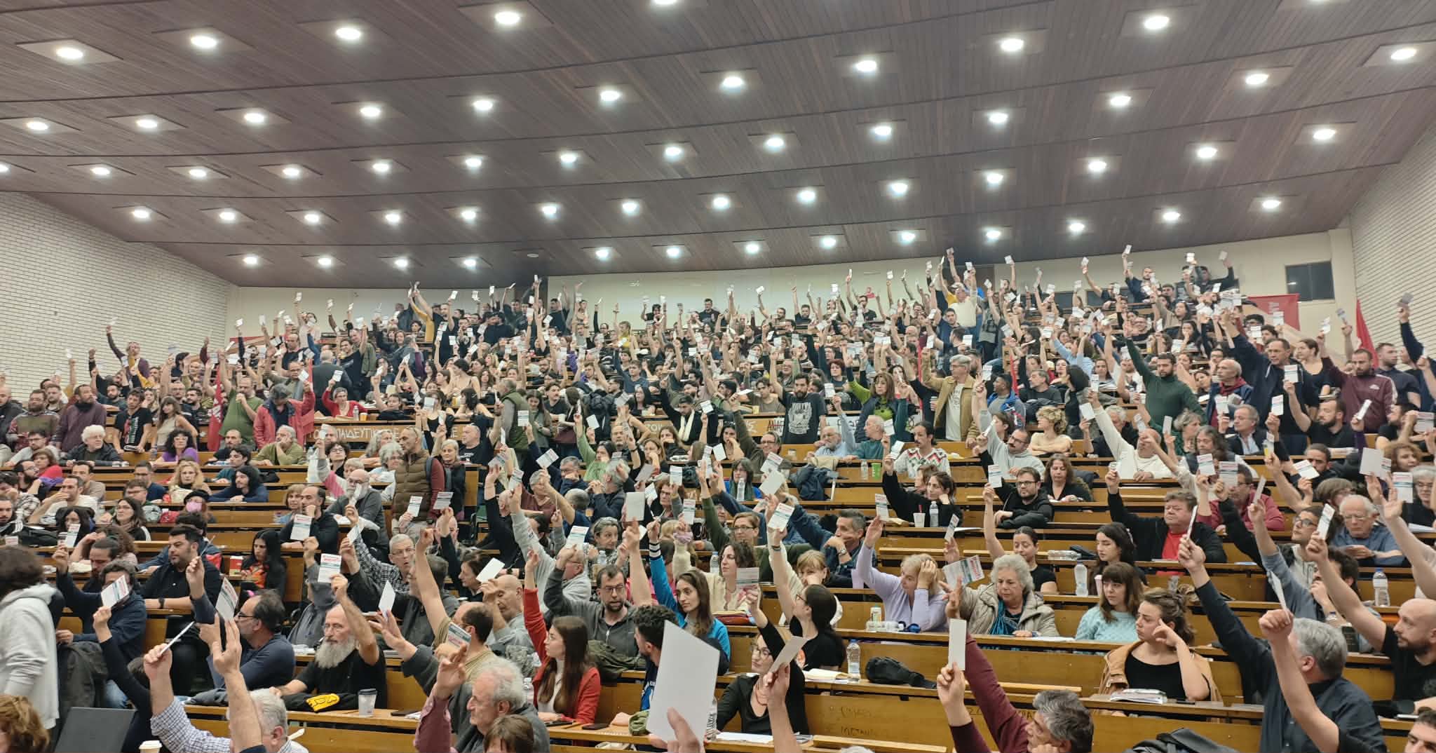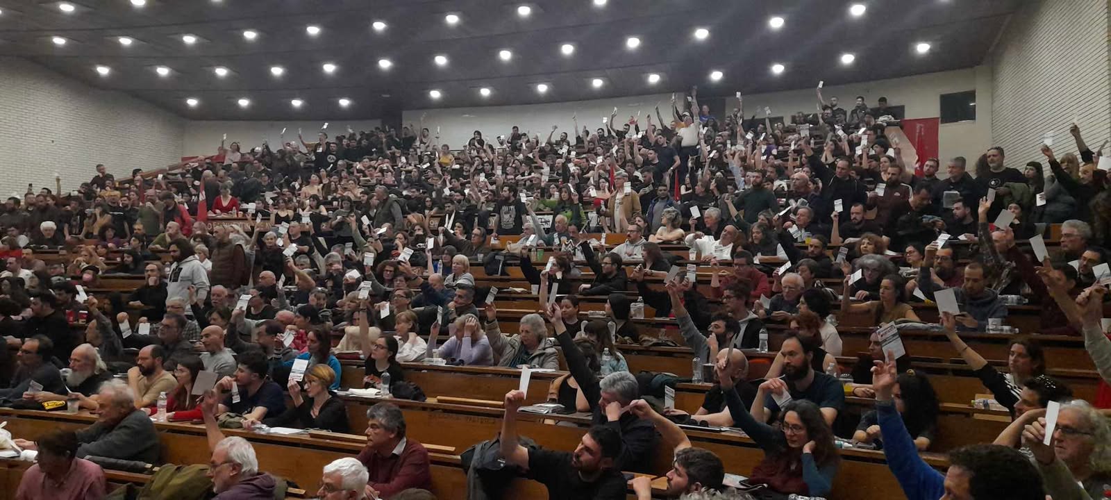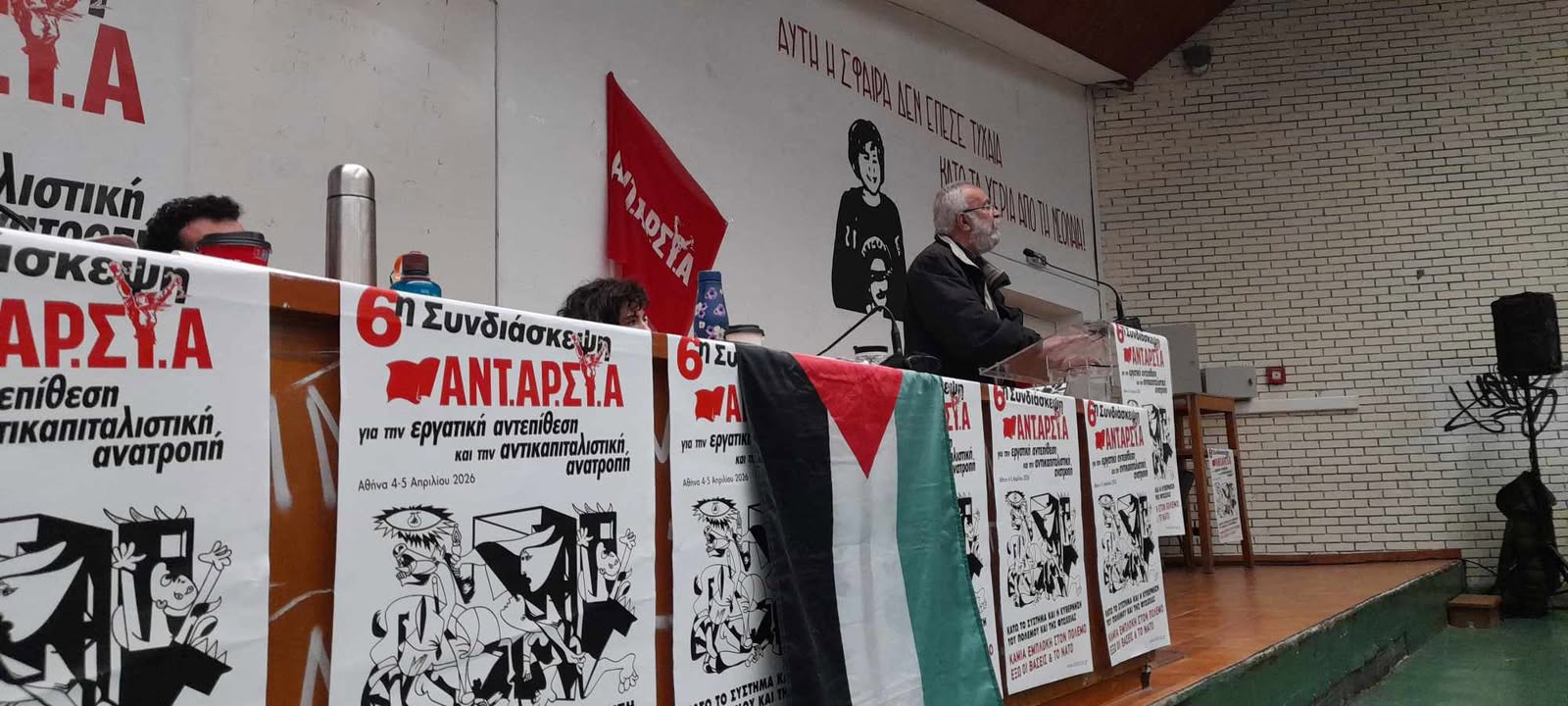 Ιδιαίτερα συγκινητική ήταν η παρέμβαση αγωνιστών από την Παλαιστίνη το Σάββατο και την Κυριακή με ολόκληρη την αίθουσα να σηκώνεται όρθια και να χειροκροτεί φωνάζοντας συνθήματα για την Παλαιστίνη.